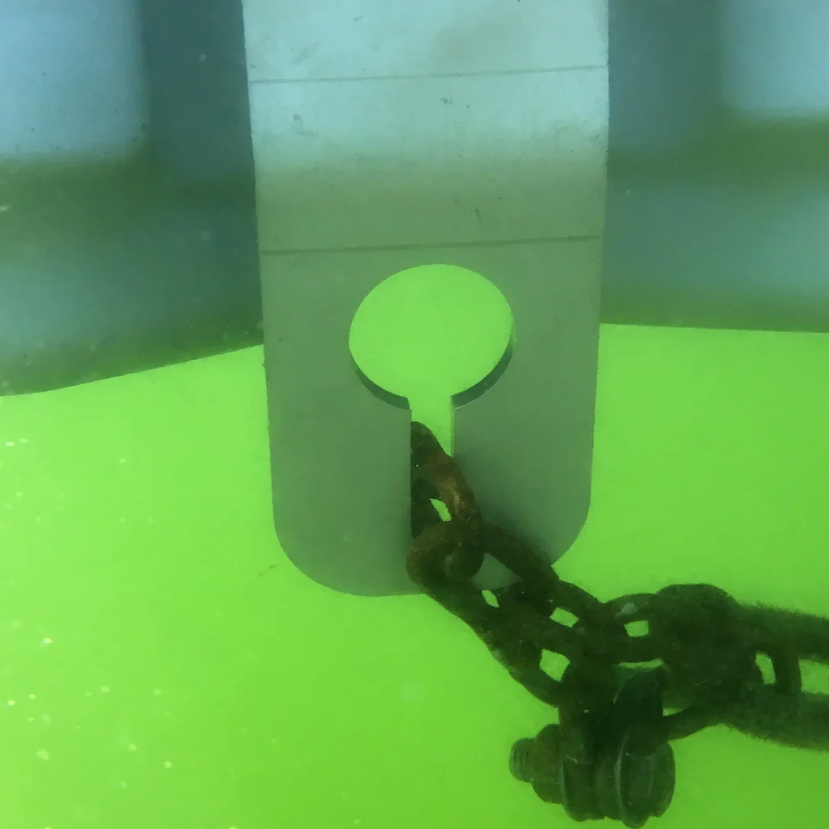 Si la chaîne est positionnée le long du bord du quai, comme le montrent les images, il n'est pas nécessaire d'entrer dans l'eau pour la régler. Vous pouvez facilement le faire en vous allongeant sur le ventre et en tendant la main vers la plaque pour l'ajuster.